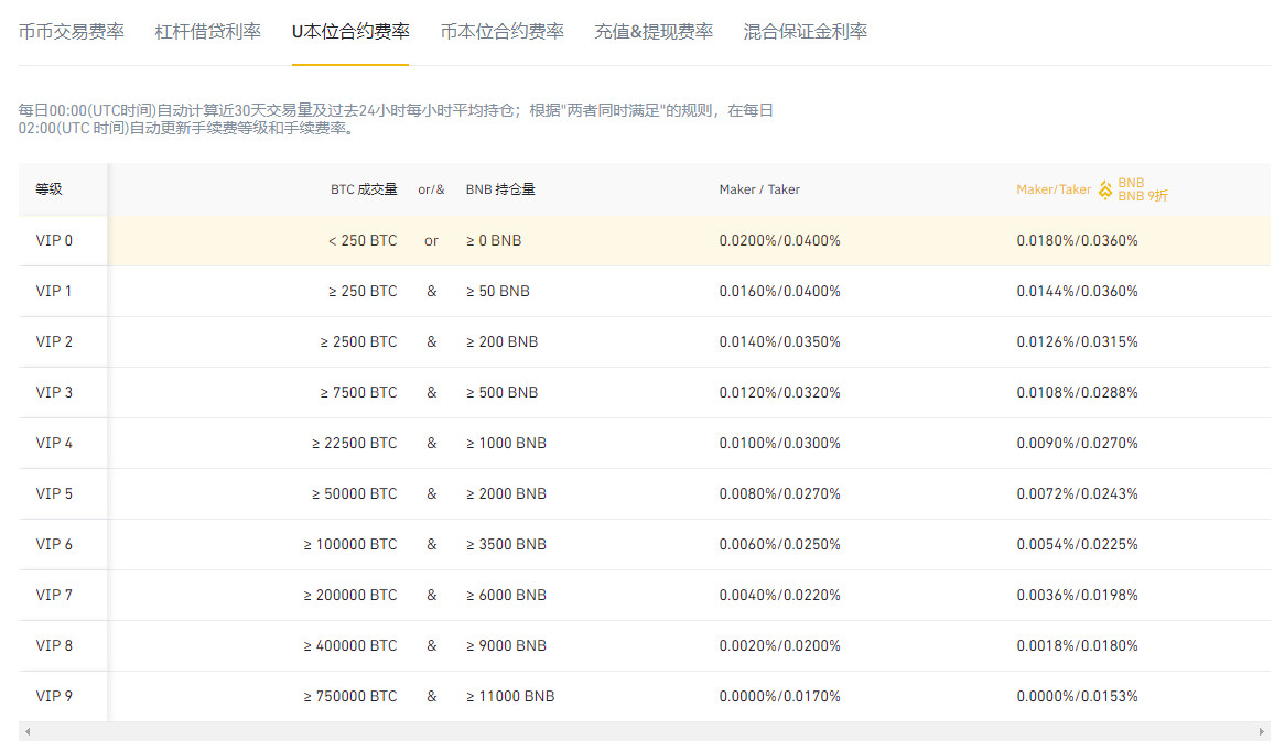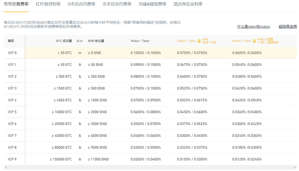 币币交易最高手续费率是0.1%,也就是万10。如果使用BNB抵扣手续费可以享受7.5折,实际的手续费是万7.5。还有一种就是在BNB抵扣的基础上再加上20%的返佣,算下来实际是万6。这样最高可以节省40%。