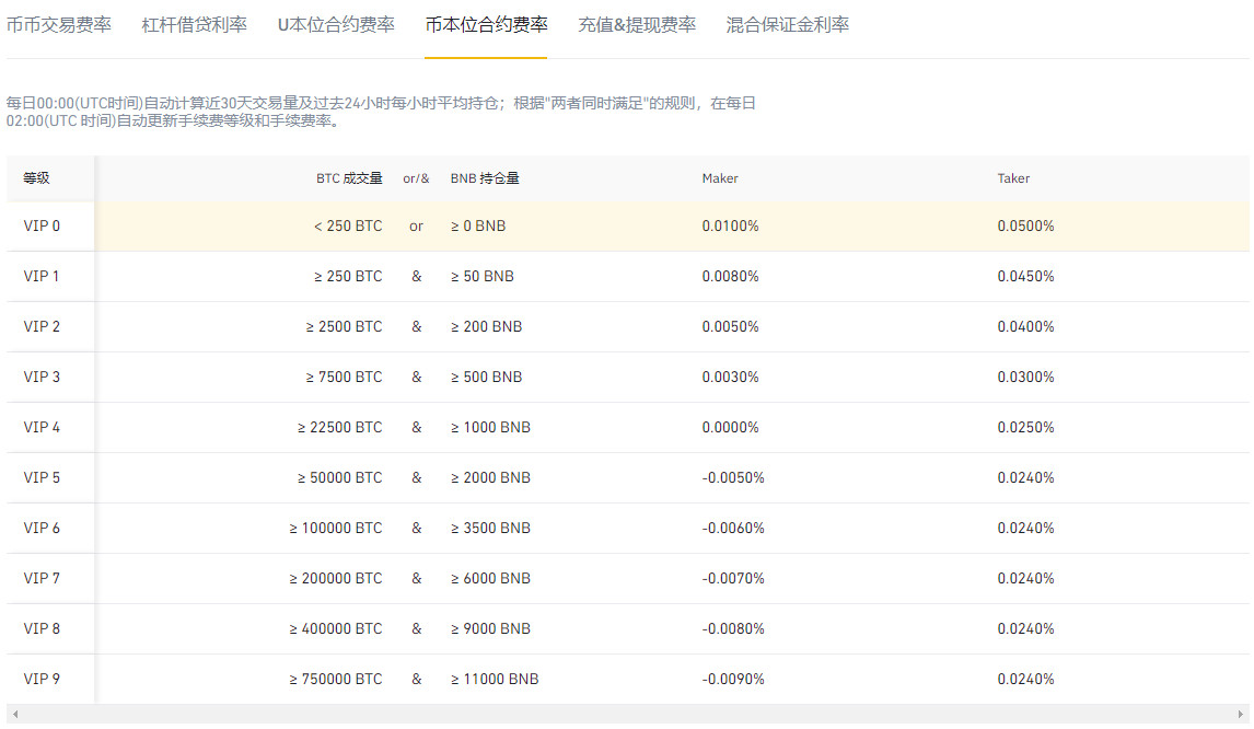 币本位合约费率Maker 和 Taker 的费率分别为万1 和 万5,没有BNB折扣,使用邀请返佣,可返10%,最高节省10%。